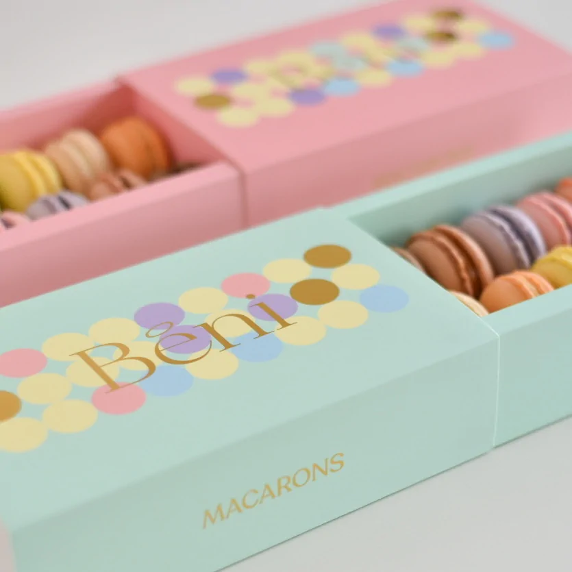 Tenemos unos empaques preciosos y exclusivos, especialmente diseñados para realzar la belleza de nuestros macarons. Son ideales para compartir y regalar a las personas más especiales, elige el color que más te guste.